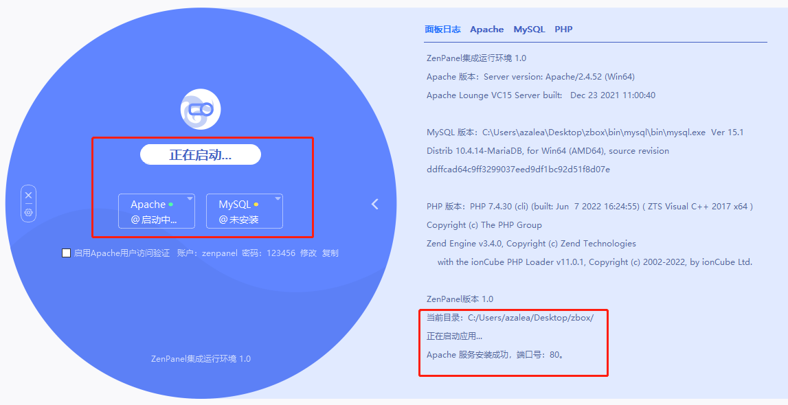 点击右侧的展开按钮,可以查看运行控制面板的日志信息,以及Apache、MySQL、PHP的版本和运行信息。